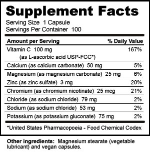 Ingredients: L-ascorbic acid USP-FCC, sodium chloride, potassium gluconate, calcium carbonate, magnesium carbonate, zinc sulfate, chromium nicotinate, magnesium stearate (vegetable lubricant), and vegan capsules.