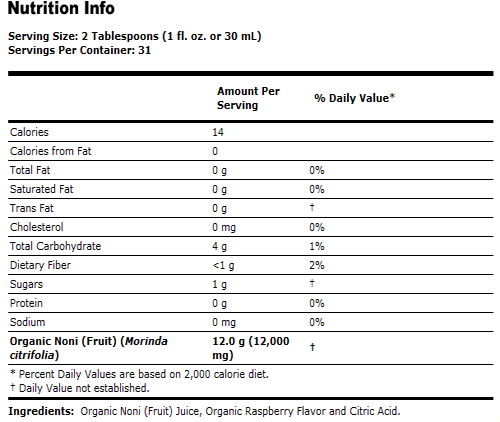 Suggested Usage: As a dietary supplement, take 2 tablespoons (1 fl. oz.) daily on an empty stomach, preferably in the morning, or as directed by your health care professional. NOW Noni Juice delivers the natural nutrient profile found in Genuine Whole Foods. Ingredients: Organic Noni (Fruit) Juice, Organic Raspberry Flavor and Citric Acid.