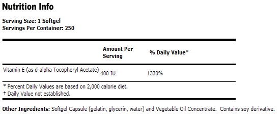 Suggested Usage: As a dietary supplement, take one softgel daily, preferably with meals. Contains only 100% natural Vitamin E.